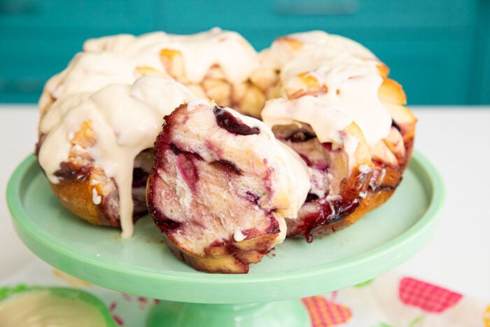 - To serve, prepare the cream cheese glaze and drizzle over the top. Pull apart the segments and plate to eat.
